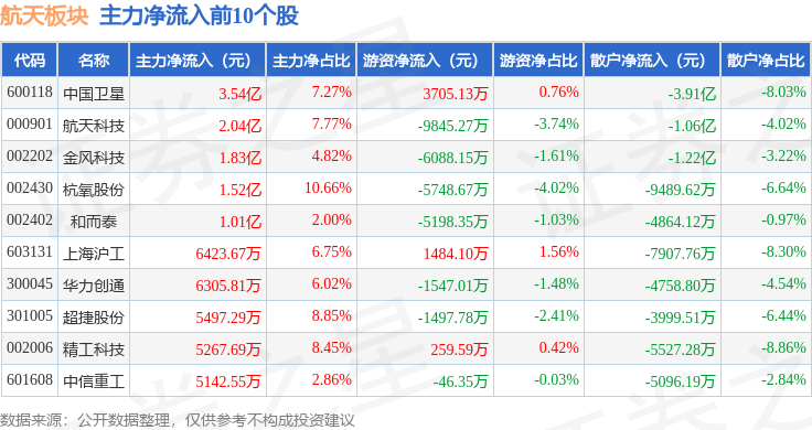 从资金流向上来看,当日航天板块主力资金净流出12.82亿元,游资资金净流入1.44亿元,散户资金净流入11.38亿元。航天板块个股资金流向见下表: