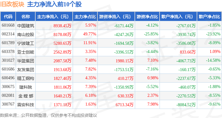 从资金流向上来看,当日旧改板块主力资金净流出9.87亿元,游资资金净流入1.27亿元,散户资金净流入8.6亿元。旧改板块个股资金流向见下表: