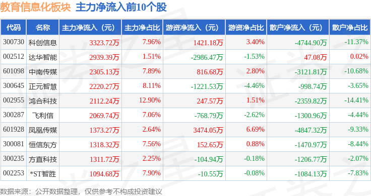 从资金流向上来看,当日教育信息化板块主力资金净流出12.27亿元,游资资金净流入4.25亿元,散户资金净流入8.02亿元。教育信息化板块个股资金流向见下表: