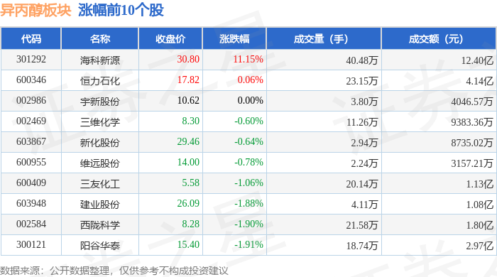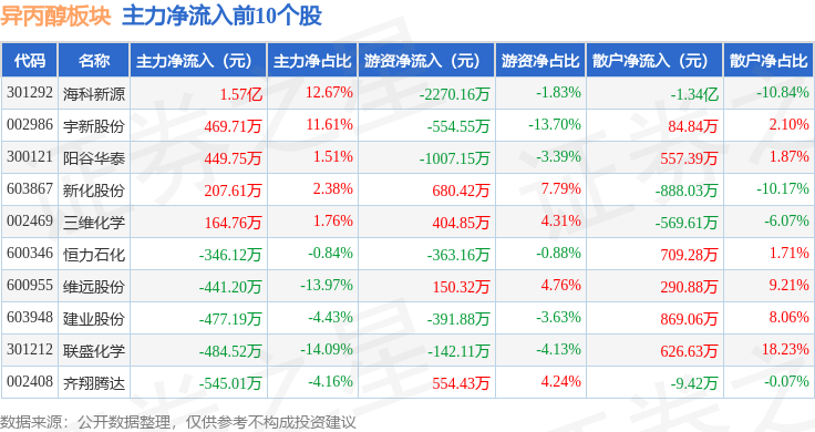 从资金流向上来看,当日异丙醇板块主力资金净流出1.6亿元,游资资金净流出6091.32万元,散户资金净流入2.21亿元。异丙醇板块个股资金流向见下表: