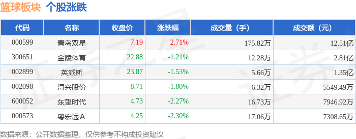 证券之星消息,10月30日篮球板块较上一交易日下跌0.64%,粤宏远A领跌。当日上证指数报收于3986.9,下跌0.73%。深证成指报收于13532.13,下跌1.16%。篮球板块个股涨跌见下表:
