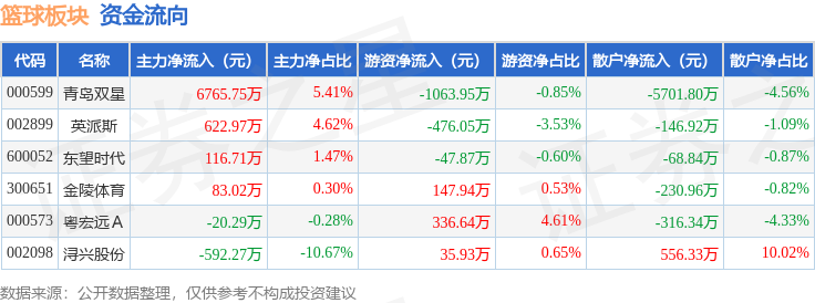 从资金流向上来看,当日篮球板块主力资金净流入6975.89万元,游资资金净流出1067.35万元,散户资金净流出5908.53万元。篮球板块个股资金流向见下表: