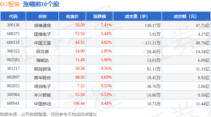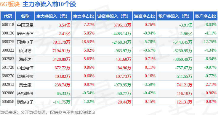 从资金流向上来看,当日6G板块主力资金净流出37.23亿元,游资资金净流入15.41亿元,散户资金净流入21.83亿元。6G板块个股资金流向见下表: