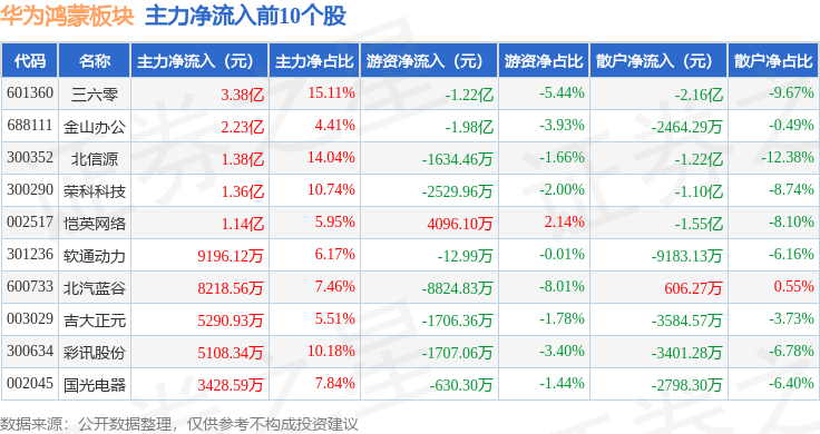 从资金流向上来看,当日华为鸿蒙板块主力资金净流出15.54亿元,游资资金净流入3.63亿元,散户资金净流入11.91亿元。华为鸿蒙板块个股资金流向见下表: