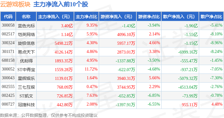 从资金流向上来看,当日云游戏板块主力资金净流出17.96亿元,游资资金净流入9.94亿元,散户资金净流入8.02亿元。云游戏板块个股资金流向见下表: