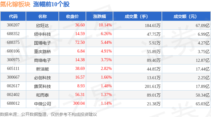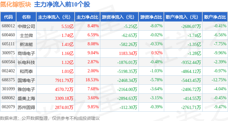 从资金流向上来看,当日氮化镓板块主力资金净流出58.79亿元,游资资金净流入9.46亿元,散户资金净流入49.33亿元。氮化镓板块个股资金流向见下表: