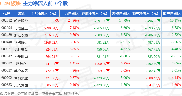 从资金流向上来看,当日C2M板块主力资金净流出7105.54万元,游资资金净流出1.69亿元,散户资金净流入2.4亿元。C2M板块个股资金流向见下表: