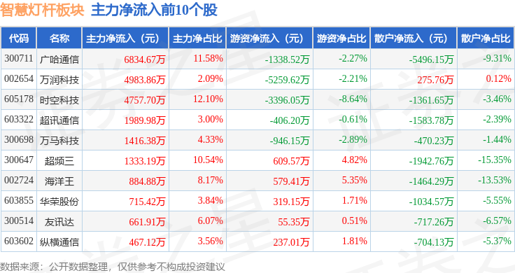 从资金流向上来看,当日智慧灯杆板块主力资金净流出9.03亿元,游资资金净流入2.53亿元,散户资金净流入6.5亿元。智慧灯杆板块个股资金流向见下表: