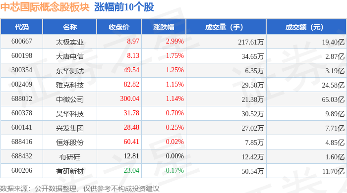 从资金流向上来看,当日中芯国际概念股板块主力资金净流出17.13亿元,游资资金净流入3.48亿元,散户资金净流入13.65亿元。中芯国际概念股板块个股资金流向见下表:
