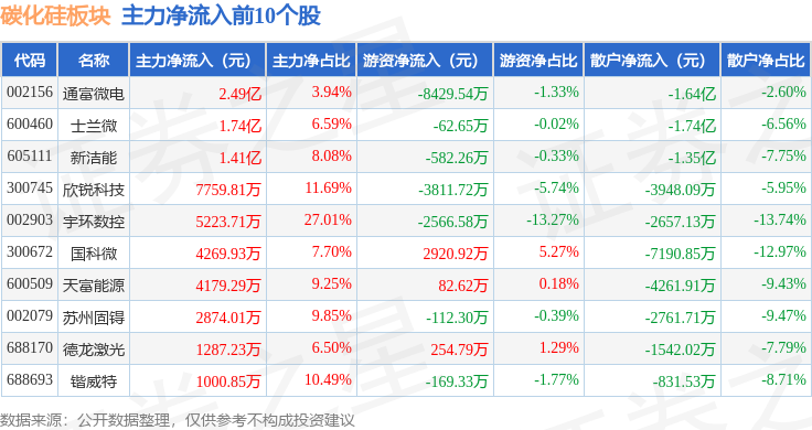从资金流向上来看,当日碳化硅板块主力资金净流出20.36亿元,游资资金净流入7.93亿元,散户资金净流入12.44亿元。碳化硅板块个股资金流向见下表: