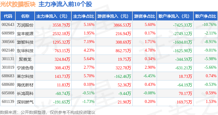 从资金流向上来看,当日光伏胶膜板块主力资金净流出3.73亿元,游资资金净流入8000.18万元,散户资金净流入2.93亿元。光伏胶膜板块个股资金流向见下表: