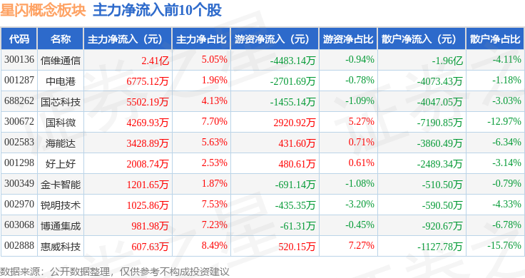 从资金流向上来看,当日星闪概念板块主力资金净流出24.1亿元,游资资金净流入8.28亿元,散户资金净流入15.82亿元。星闪概念板块个股资金流向见下表: