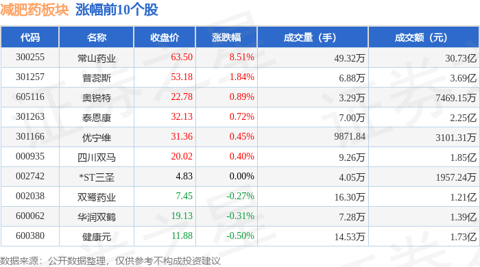 证券之星消息,10月30日减肥药板块较上一交易日下跌1.27%,翰宇药业领跌。当日上证指数报收于3986.9,下跌0.73%。深证成指报收于13532.13,下跌1.16%。减肥药板块个股涨跌见下表: