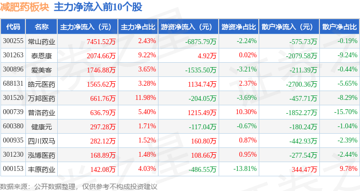从资金流向上来看,当日减肥药板块主力资金净流出8.3亿元,游资资金净流入1.99亿元,散户资金净流入6.32亿元。减肥药板块个股资金流向见下表: