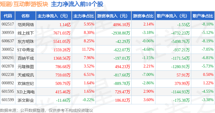 从资金流向上来看,当日短剧/互动影游板块主力资金净流出7.98亿元,游资资金净流入1.43亿元,散户资金净流入6.55亿元。短剧/互动影游板块个股资金流向见下表:
