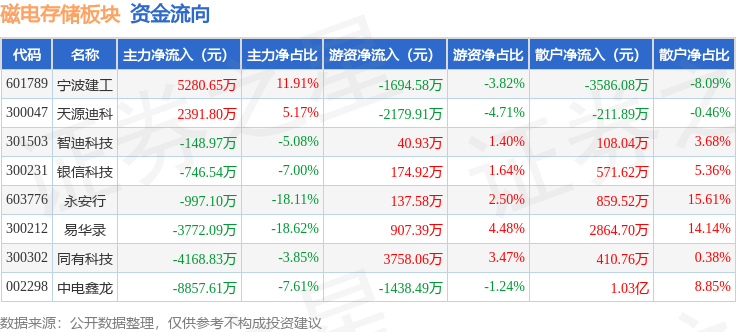 从资金流向上来看,当日磁电存储板块主力资金净流出1.1亿元,游资资金净流出294.08万元,散户资金净流入1.13亿元。磁电存储板块个股资金流向见下表: