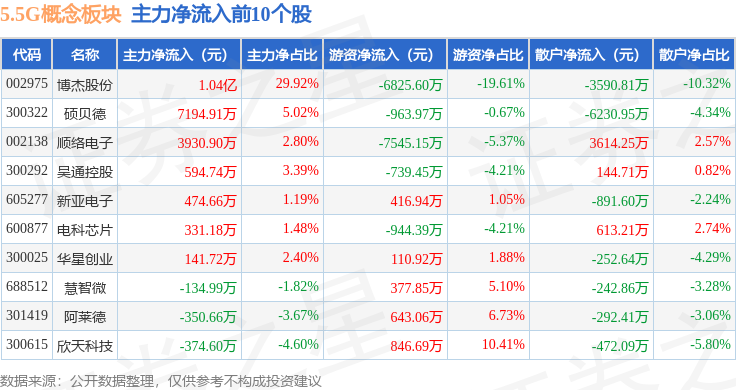 从资金流向上来看,当日5.5G概念板块主力资金净流出20.86亿元,游资资金净流入5.42亿元,散户资金净流入15.44亿元。5.5G概念板块个股资金流向见下表: