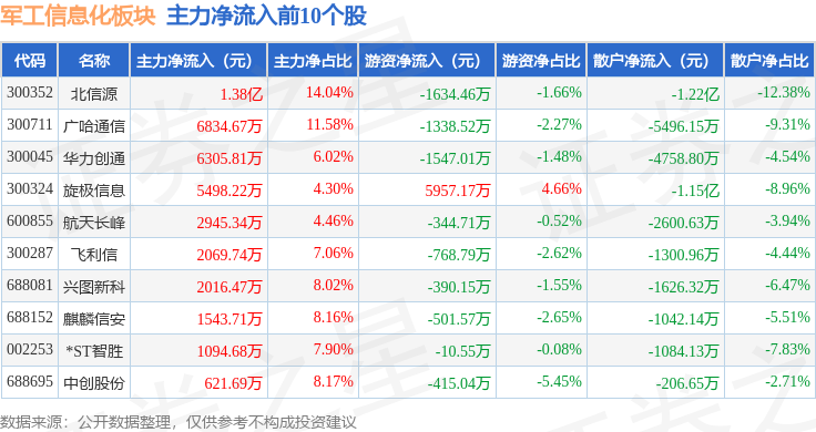 从资金流向上来看,当日军工信息化板块主力资金净流出8.26亿元,游资资金净流入2.48亿元,散户资金净流入5.79亿元。军工信息化板块个股资金流向见下表: