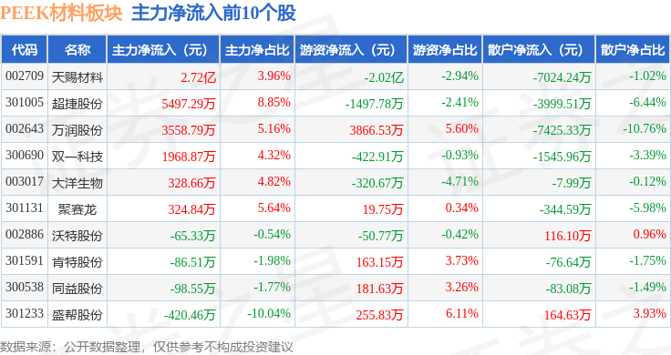 从资金流向上来看,当日PEEK材料板块主力资金净流出4.95亿元,游资资金净流出2535.65万元,散户资金净流入5.2亿元。PEEK材料板块个股资金流向见下表: