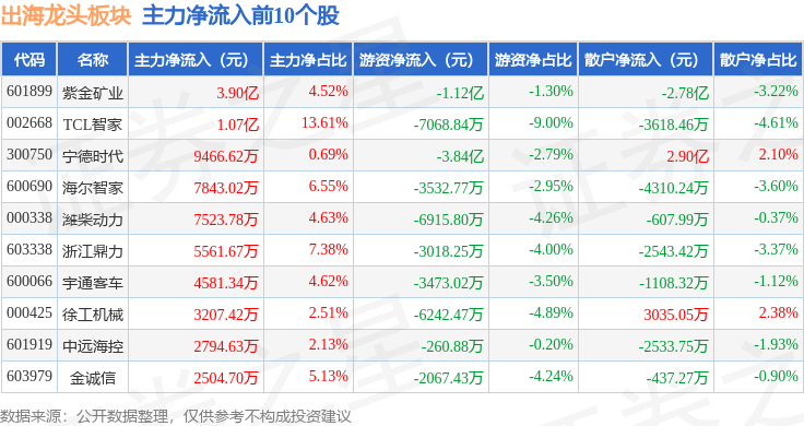 从资金流向上来看,当日出海龙头板块主力资金净流出161.34亿元,游资资金净流入55.53亿元,散户资金净流入105.8亿元。出海龙头板块个股资金流向见下表: