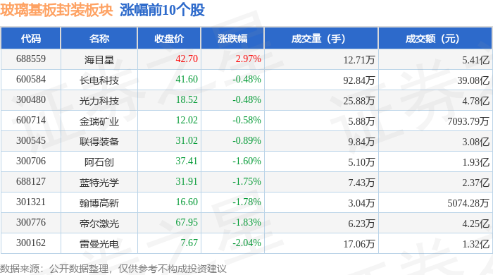 证券之星消息,10月30日玻璃基板封装板块较上一交易日下跌2.74%,隆利科技领跌。当日上证指数报收于3986.9,下跌0.73%。深证成指报收于13532.13,下跌1.16%。玻璃基板封装板块个股涨跌见下表: