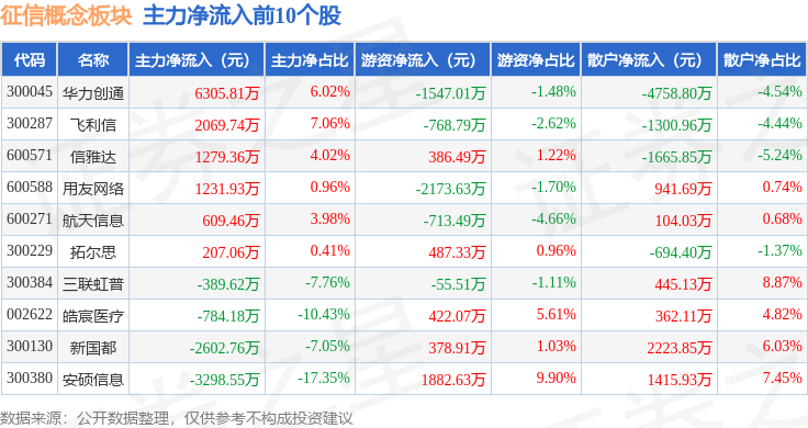 从资金流向上来看,当日征信概念板块主力资金净流出5.02亿元,游资资金净流入7262.66万元,散户资金净流入4.29亿元。征信概念板块个股资金流向见下表: