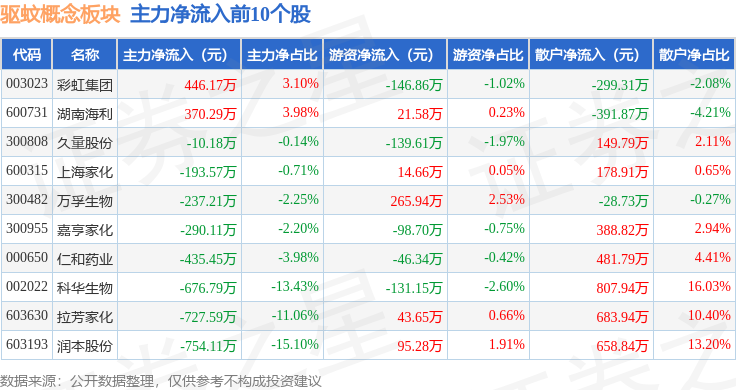 从资金流向上来看,当日驱蚊概念板块主力资金净流出3.5亿元,游资资金净流入3282.72万元,散户资金净流入3.17亿元。驱蚊概念板块个股资金流向见下表: