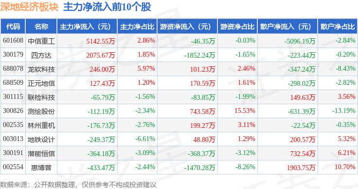 从资金流向上来看,当日深地经济板块主力资金净流出8.34亿元,游资资金净流出1.19亿元,散户资金净流入9.53亿元。深地经济板块个股资金流向见下表: