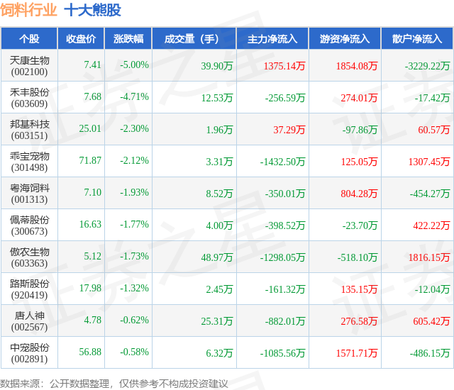 个股表现方面,饲料行业当日领跌股为天康生物(002100),该股当日报收7.41,下跌5.0%,成交量39.9万,主力资金净流入1375.14万元。禾丰股份(603609)以下跌4.71%紧随其后,该股当日成交量12.53万,主力资金净流出256.59万元。除此之外,邦基科技(603151)、乖宝宠物(301498)、粤海饲料(001313)均进入当日熊股之列。具体个股列表见下表: