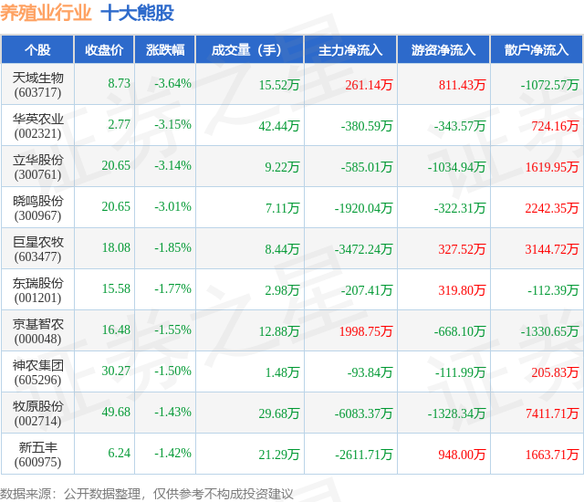 个股表现方面,养殖业行业当日领跌股为天域生物(603717),该股当日报收8.73,下跌3.64%,成交量15.52万,主力资金净流入261.14万元。华英农业(002321)以下跌3.15%紧随其后,该股当日成交量42.44万,主力资金净流出380.59万元。除此之外,立华股份(300761)、晓鸣股份(300967)、巨星农牧(603477)均进入当日熊股之列。具体个股列表见下表: