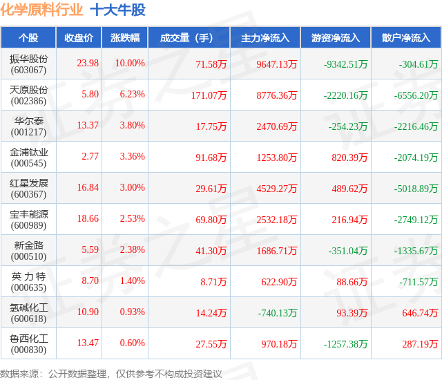 个股表现方面,化学原料行业当日领涨股为振华股份(603067),该股当日报收23.98,上涨10.0%,成交量71.58万,主力资金净流入9647.13万元。天原股份(002386)以上涨6.23%紧随其后,该股当日成交量171.07万,主力资金净流入8776.36万元。除此之外,华尔泰(001217)、金浦钛业(000545)、红星发展(600367)均进入当日牛股之列。具体个股列表见下表: