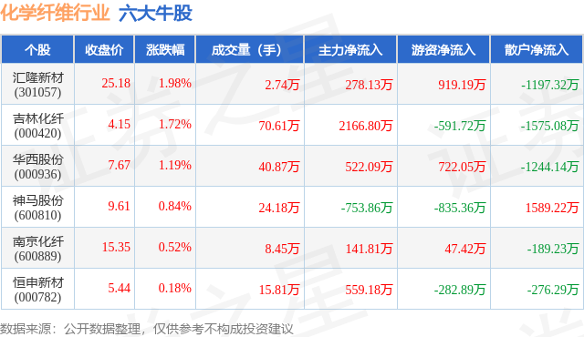个股表现方面,化学纤维行业当日领涨股为汇隆新材(301057),该股当日报收25.18,上涨1.98%,成交量2.74万,主力资金净流入278.13万元。吉林化纤(000420)以上涨1.72%紧随其后,该股当日成交量70.61万,主力资金净流入2166.8万元。除此之外,华西股份(000936)、神马股份(600810)、南京化纤(600889)均进入当日牛股之列。具体个股列表见下表: