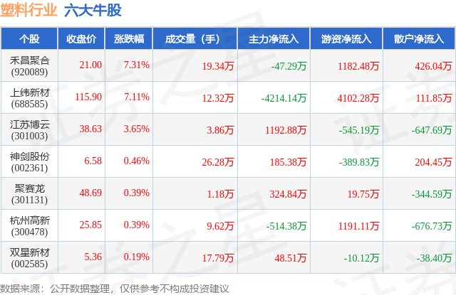 个股表现方面,塑料行业当日领涨股为禾昌聚合(920089),该股当日报收21.0,上涨7.31%,成交量19.34万,主力资金净流出47.29万元。上纬新材(688585)以上涨7.11%紧随其后,该股当日成交量12.32万,主力资金净流出4214.14万元。除此之外,江苏博云(301003)、神剑股份(002361)、聚赛龙(301131)均进入当日牛股之列。具体个股列表见下表: