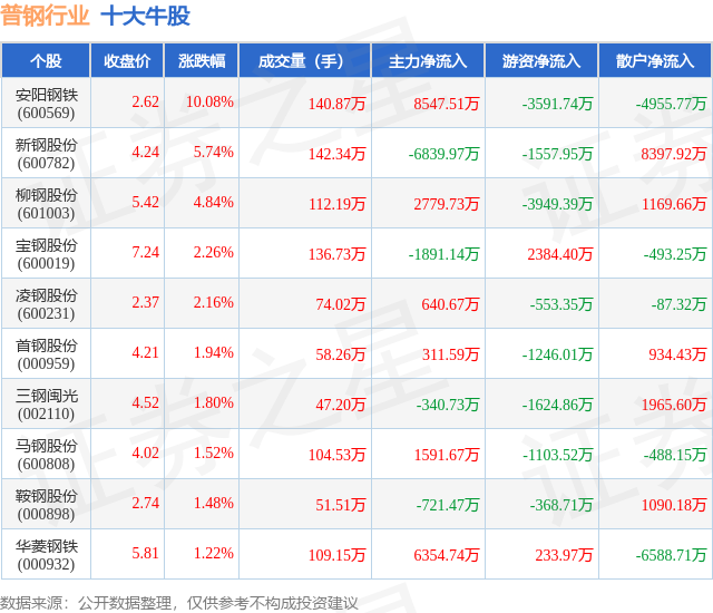 个股表现方面,普钢行业当日领涨股为安阳钢铁(600569),该股当日报收2.62,上涨10.08%,成交量140.87万,主力资金净流入8547.51万元。新钢股份(600782)以上涨5.74%紧随其后,该股当日成交量142.34万,主力资金净流出6839.97万元。除此之外,柳钢股份(601003)、宝钢股份(600019)、凌钢股份(600231)均进入当日牛股之列。具体个股列表见下表: