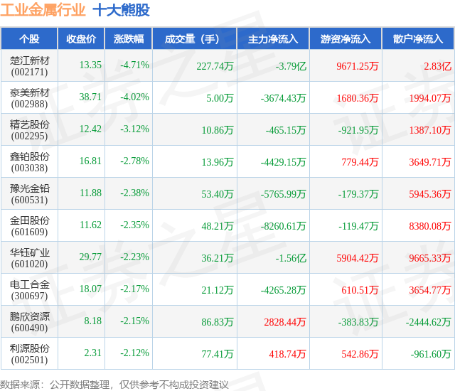 个股表现方面,工业金属行业当日领跌股为楚江新材(002171),该股当日报收13.35,下跌4.71%,成交量227.74万,主力资金净流出3.79亿元。豪美新材(002988)以下跌4.02%紧随其后,该股当日成交量5.0万,主力资金净流出3674.43万元。除此之外,精艺股份(002295)、鑫铂股份(003038)、豫光金铅(600531)均进入当日熊股之列。具体个股列表见下表:
