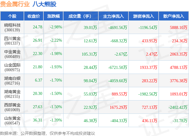 个股表现方面,贵金属行业当日领跌股为晓程科技(300139),该股当日报收24.78,下跌2.98%,成交量39.01万,主力资金净流出4691.56万元。四川黄金(001337)以下跌2.22%紧随其后,该股当日成交量12.61万,主力资金净流出668.32万元。除此之外,中金黄金(600489)、山金国际(000975)、湖南白银(002716)均进入当日熊股之列。具体个股列表见下表: