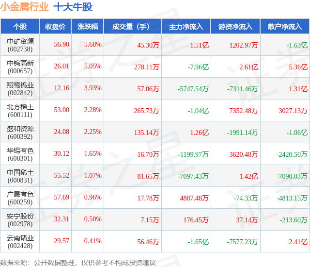 个股表现方面,小金属行业当日领涨股为中矿资源(002738),该股当日报收56.9,上涨5.68%,成交量45.3万,主力资金净流入1.51亿元。中钨高新(000657)以上涨5.05%紧随其后,该股当日成交量278.11万,主力资金净流出7.96亿元。除此之外,翔鹭钨业(002842)、北方稀土(600111)、盛和资源(600392)均进入当日牛股之列。具体个股列表见下表: