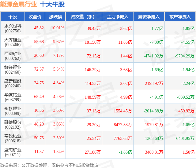 个股表现方面,能源金属行业当日领涨股为永兴材料(002756),该股当日报收45.82,上涨10.01%,成交量39.45万,主力资金净流入3.62亿元。天齐锂业(002466)以上涨9.67%紧随其后,该股当日成交量181.5万,主力资金净流入11.85亿元。除此之外,西藏矿业(000762)、赣锋锂业(002460)、盛新锂能(002240)均进入当日牛股之列。具体个股列表见下表: