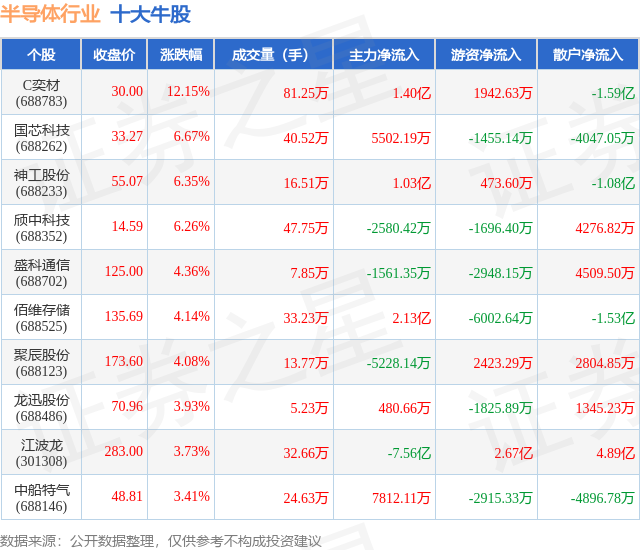 个股表现方面,半导体行业当日领涨股为C奕材(688783),该股当日报收30.0,上涨12.15%,成交量81.25万,主力资金净流入1.4亿元。国芯科技(688262)以上涨6.67%紧随其后,该股当日成交量40.52万,主力资金净流入5502.19万元。除此之外,神工股份(688233)、颀中科技(688352)、盛科通信(688702)均进入当日牛股之列。具体个股列表见下表: