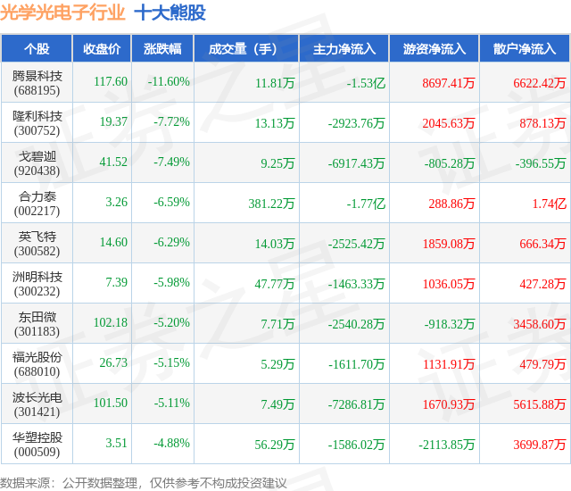 个股表现方面,光学光电子行业当日领跌股为腾景科技(688195),该股当日报收117.6,下跌11.6%,成交量11.81万,主力资金净流出1.53亿元。隆利科技(300752)以下跌7.72%紧随其后,该股当日成交量13.13万,主力资金净流出2923.76万元。除此之外,戈碧迦(920438)、合力泰(002217)、英飞特(300582)均进入当日熊股之列。具体个股列表见下表:
