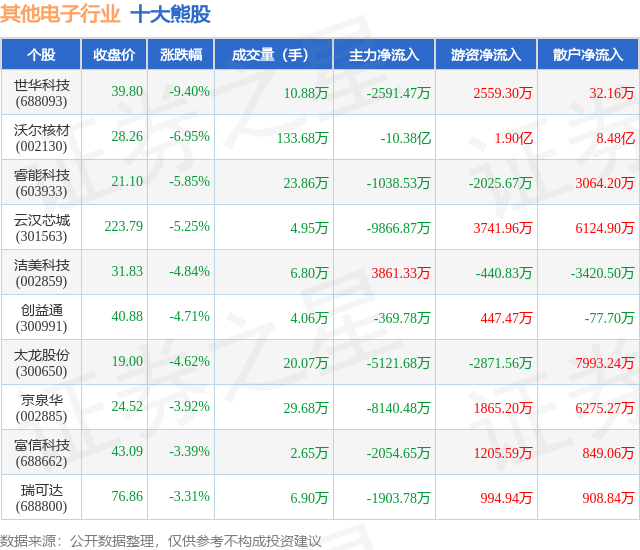 个股表现方面,其他电子行业当日领跌股为世华科技(688093),该股当日报收39.8,下跌9.4%,成交量10.88万,主力资金净流出2591.47万元。沃尔核材(002130)以下跌6.95%紧随其后,该股当日成交量133.68万,主力资金净流出10.38亿元。除此之外,睿能科技(603933)、云汉芯城(301563)、洁美科技(002859)均进入当日熊股之列。具体个股列表见下表: