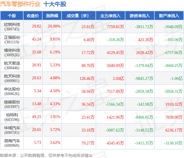 个股表现方面,汽车零部件行业当日领涨股为欣锐科技(300745),该股当日报收29.82,上涨20.0%,成交量23.81万,主力资金净流入7759.81万元。正强股份(301119)以上涨9.81%紧随其后,该股当日成交量6.4万,主力资金净流出318.26万元。除此之外,博俊科技(300926)、航天智造(300446)、航天科技(000901)均进入当日牛股之列。具体个股列表见下表: