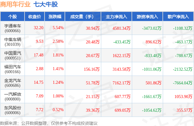 个股表现方面,商用车行业当日领涨股为宇通客车(600066),该股当日报收32.2,上涨5.54%,成交量30.94万,主力资金净流入4581.34万元。中集车辆(301039)以上涨2.58%紧随其后,该股当日成交量20.48万,主力资金净流出433.45万元。除此之外,中国重汽(000951)、福田汽车(600166)、金龙汽车(600686)均进入当日牛股之列。具体个股列表见下表:
