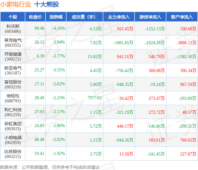 个股表现方面,小家电行业当日领跌股为科沃斯(603486),该股当日报收90.4,下跌4.16%,成交量6.53万,主力资金净流入921.45万元。莱克电气(603355)以下跌3.94%紧随其后,该股当日成交量7.82万,主力资金净流出1081.85万元。除此之外,开能健康(300272)、欧圣电气(301187)、富佳股份(603219)均进入当日熊股之列。具体个股列表见下表: