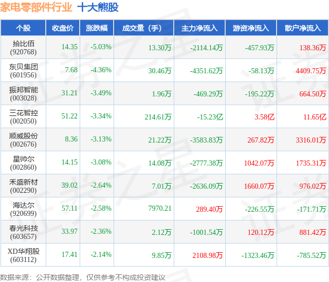 个股表现方面,家电零部件行业当日领跌股为拾比佰(920768),该股当日报收14.35,下跌5.03%,成交量13.3万,主力资金净流出2114.14万元。东贝集团(601956)以下跌4.36%紧随其后,该股当日成交量30.46万,主力资金净流出4351.62万元。除此之外,振邦智能(003028)、三花智控(002050)、顺威股份(002676)均进入当日熊股之列。具体个股列表见下表:
