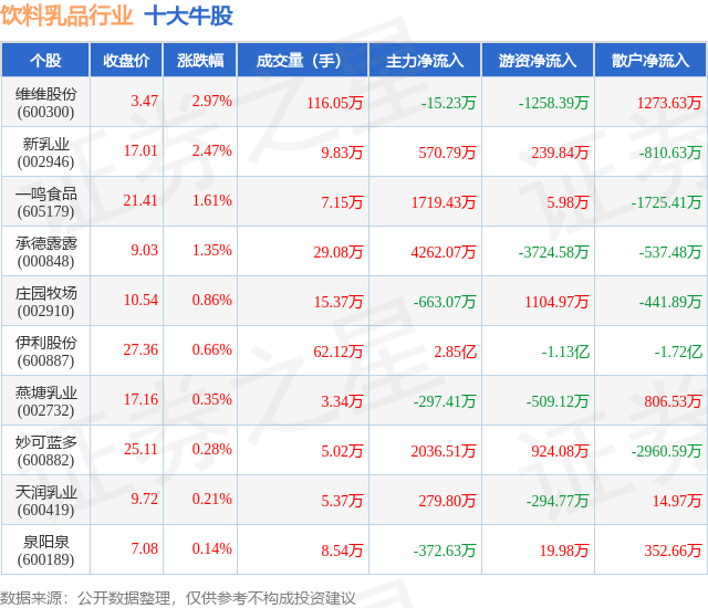 个股表现方面,饮料乳品行业当日领涨股为维维股份(600300),该股当日报收3.47,上涨2.97%,成交量116.05万,主力资金净流出15.23万元。新乳业(002946)以上涨2.47%紧随其后,该股当日成交量9.83万,主力资金净流入570.79万元。除此之外,一鸣食品(605179)、承德露露(000848)、庄园牧场(002910)均进入当日牛股之列。具体个股列表见下表: