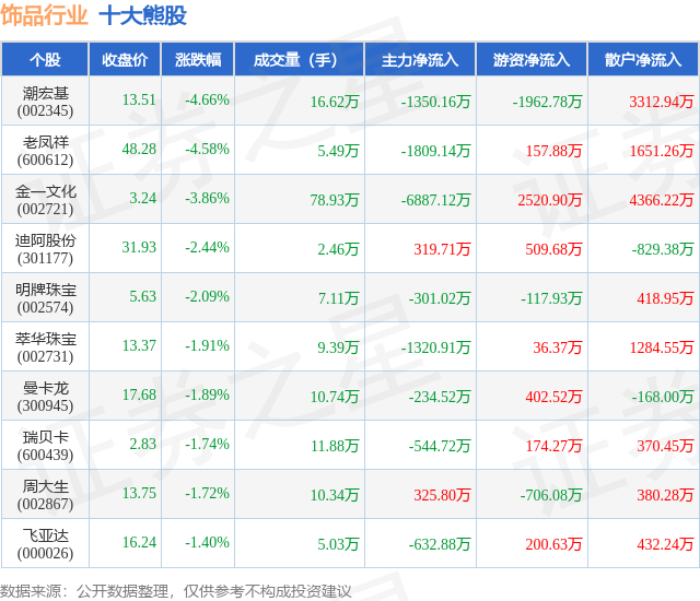 个股表现方面,饰品行业当日领跌股为潮宏基(002345),该股当日报收13.51,下跌4.66%,成交量16.62万,主力资金净流出1350.16万元。老凤祥(600612)以下跌4.58%紧随其后,该股当日成交量5.49万,主力资金净流出1809.14万元。除此之外,金一文化(002721)、迪阿股份(301177)、明牌珠宝(002574)均进入当日熊股之列。具体个股列表见下表: