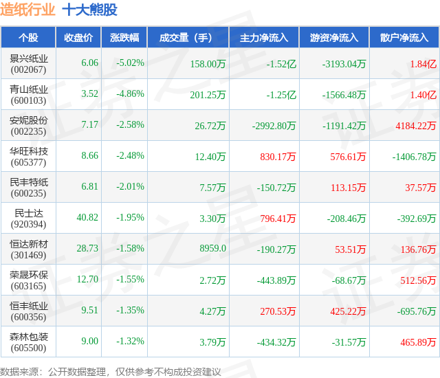 个股表现方面,造纸行业当日领跌股为景兴纸业(002067),该股当日报收6.06,下跌5.02%,成交量158.0万,主力资金净流出1.52亿元。青山纸业(600103)以下跌4.86%紧随其后,该股当日成交量201.25万,主力资金净流出1.25亿元。除此之外,安妮股份(002235)、华旺科技(605377)、民丰特纸(600235)均进入当日熊股之列。具体个股列表见下表: