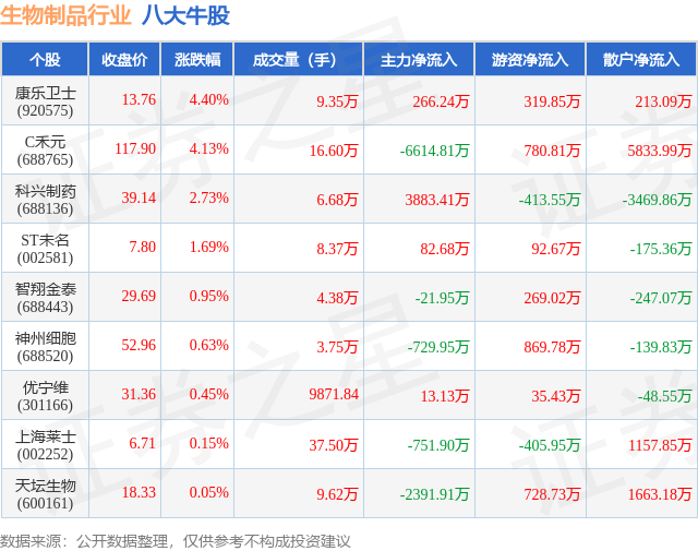 个股表现方面,生物制品行业当日领涨股为康乐卫士(920575),该股当日报收13.76,上涨4.4%,成交量9.35万,主力资金净流入266.24万元。C禾元(688765)以上涨4.13%紧随其后,该股当日成交量16.6万,主力资金净流出6614.81万元。除此之外,科兴制药(688136)、ST未名(002581)、智翔金泰(688443)均进入当日牛股之列。具体个股列表见下表: