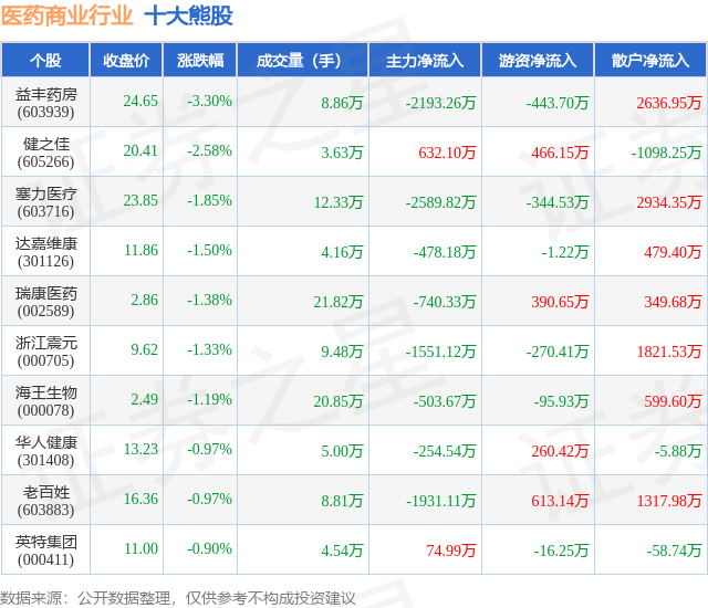 个股表现方面,医药商业行业当日领跌股为益丰药房(603939),该股当日报收24.65,下跌3.3%,成交量8.86万,主力资金净流出2193.26万元。健之佳(605266)以下跌2.58%紧随其后,该股当日成交量3.63万,主力资金净流入632.1万元。除此之外,塞力医疗(603716)、达嘉维康(301126)、瑞康医药(002589)均进入当日熊股之列。具体个股列表见下表: